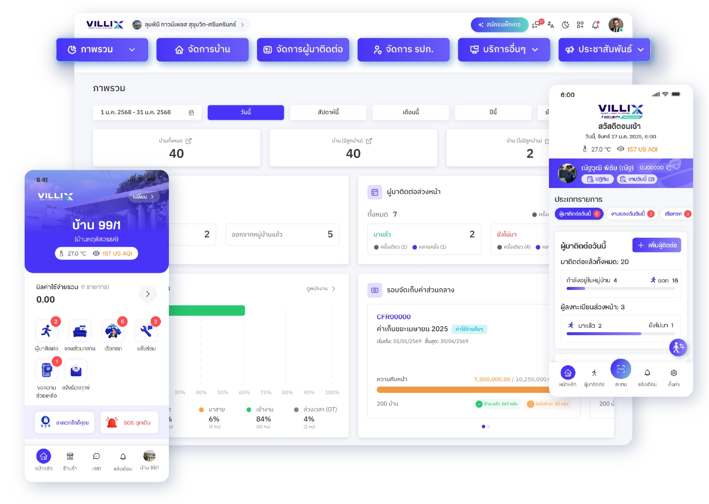 VILLIX ออกแบบมาเพื่อเพิ่มความสะดวกและความสบายให้ทุกคนในหมู่บ้าน ตั้งแต่นิติบุคคล ลูกบ้าน ไปจนถึงทีมรักษาความปลอดภัย—ทั้งหมดในระบบเดียวที่เชื่อมต่อกันอย่างสมบูรณ์